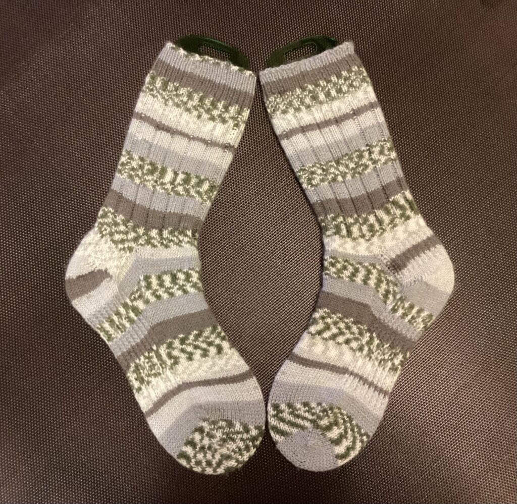 今の編み物熱は、入所した母に贈りたいという思いから、毎日使えるのではないかと靴下を作ることから始まった。靴下は構造が難しそうという思い込みでこれまで手をつけずにいた。作り出すと、奥が深いことを知り、どんどんのめり込んでいった。踵の作り方は幾通りもあるみたいだし、つま先から編み始めたり、履き口から始めたり、作り方がいろいろある。しかもデザイン豊富。今は、動画サイトでたくさんの方が作り方をあげていて、わからなくて困るということがない。