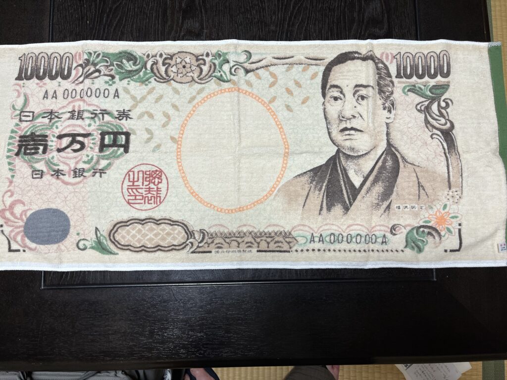 ・一万円札の柄のフェイスタオルを発見した。これはどこで手に入れたのだろうか。他のタオルとは別のところに収納していたから、どこかから貰ったものなのだろう。