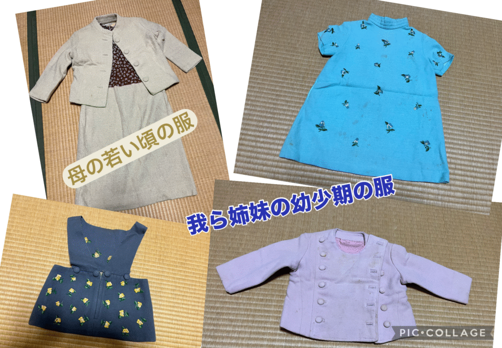 ・押入には、大きなブリキ製の行李が3台あり、中を除くと、ほとんど物は入っていないのだが、相当古い衣類が収められていた。昔の私たち姉妹の服、母の若い頃の服があり、驚いた。きっと、母はこれだけは捨てきれずに置いていたのであろう、と推測する。なので、とっておくことにする。
