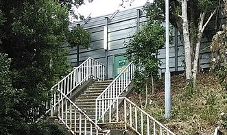 住宅街脇の階段上り、扉を開けると高速道路。不思議な空間だ。