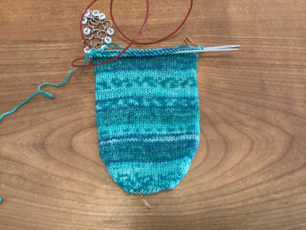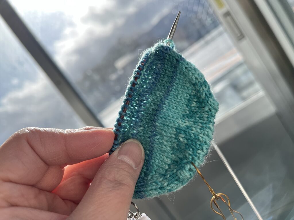 帰りのバス車中で編み続けて、ここまで育った靴下。